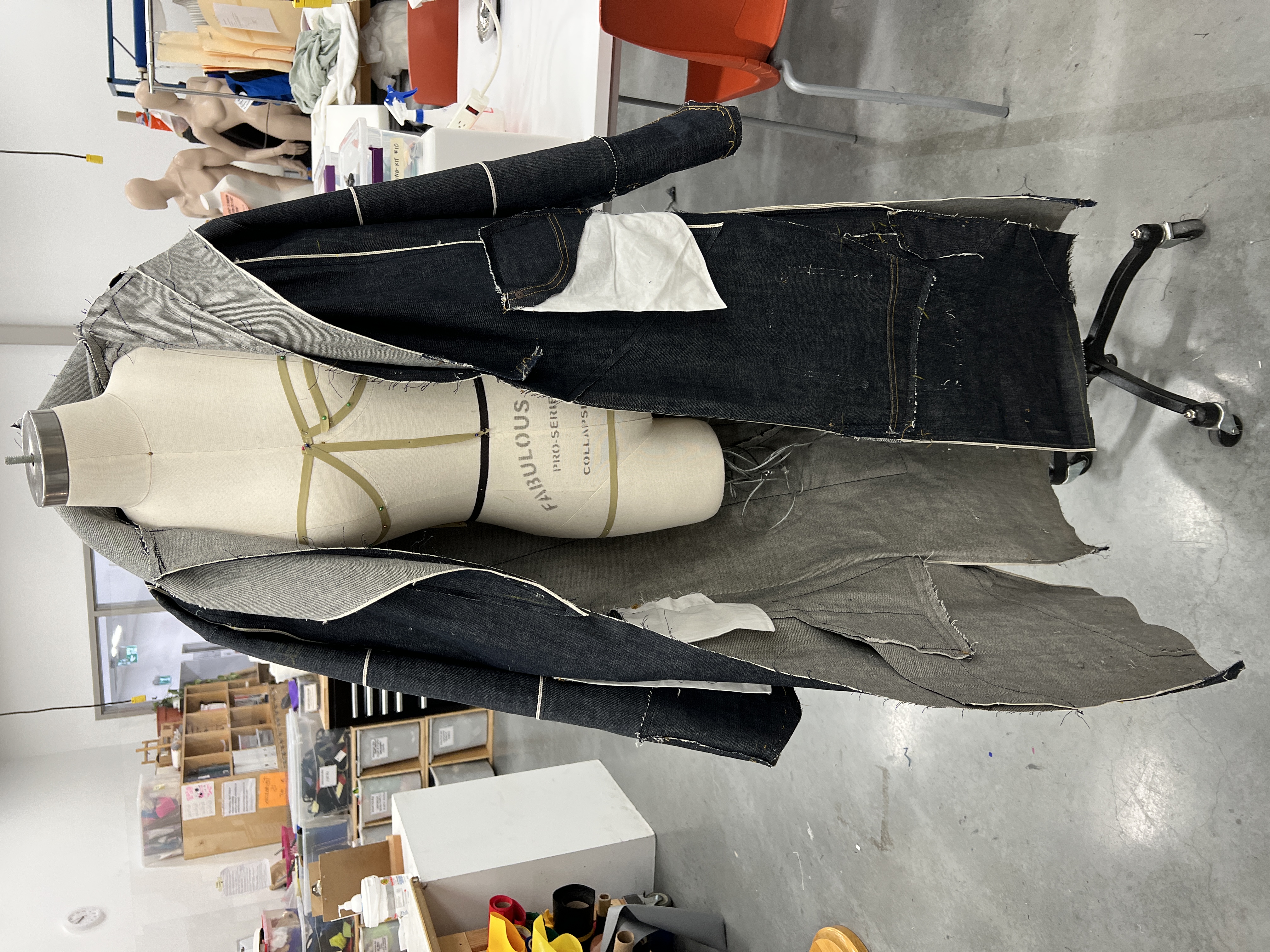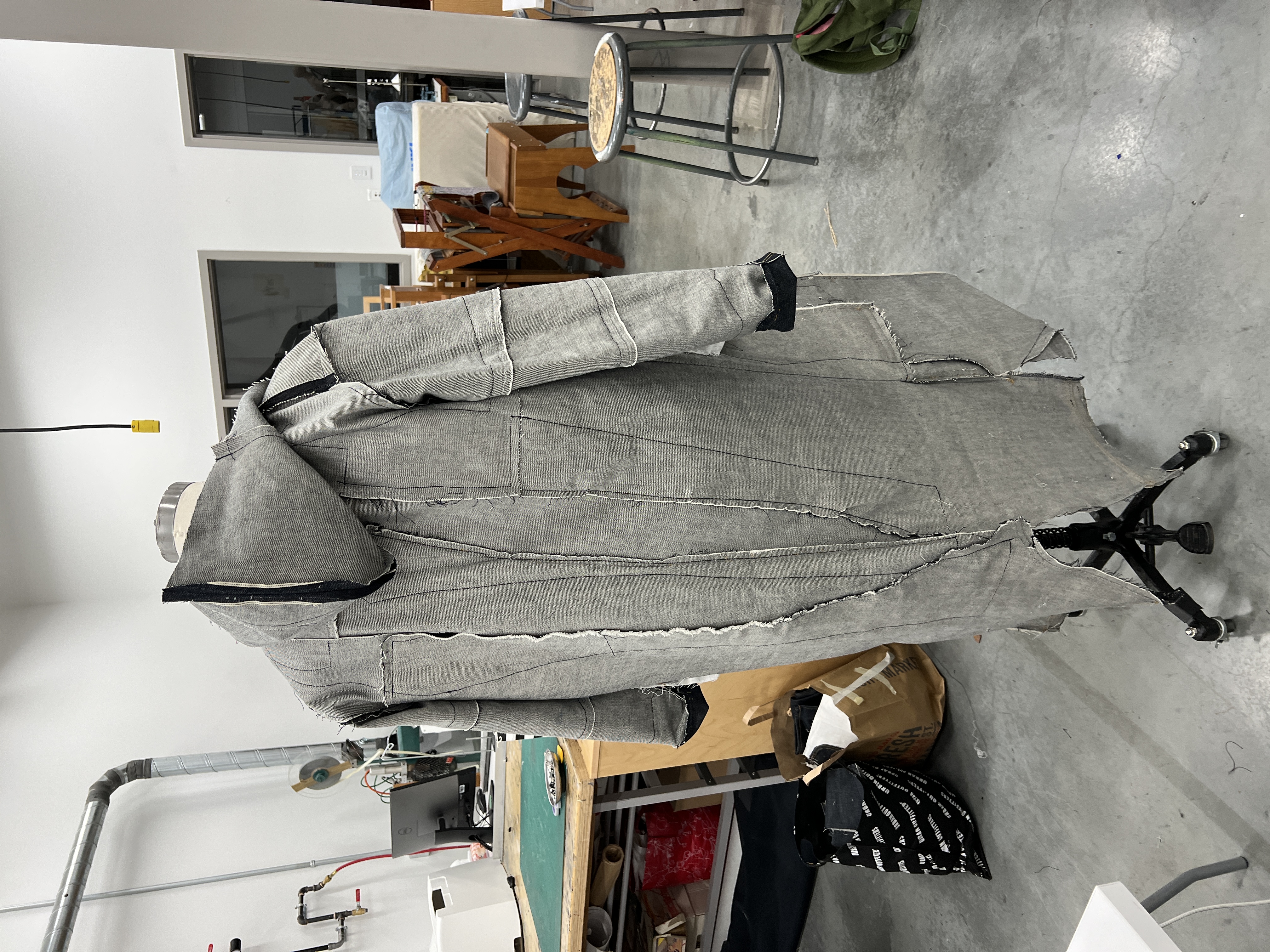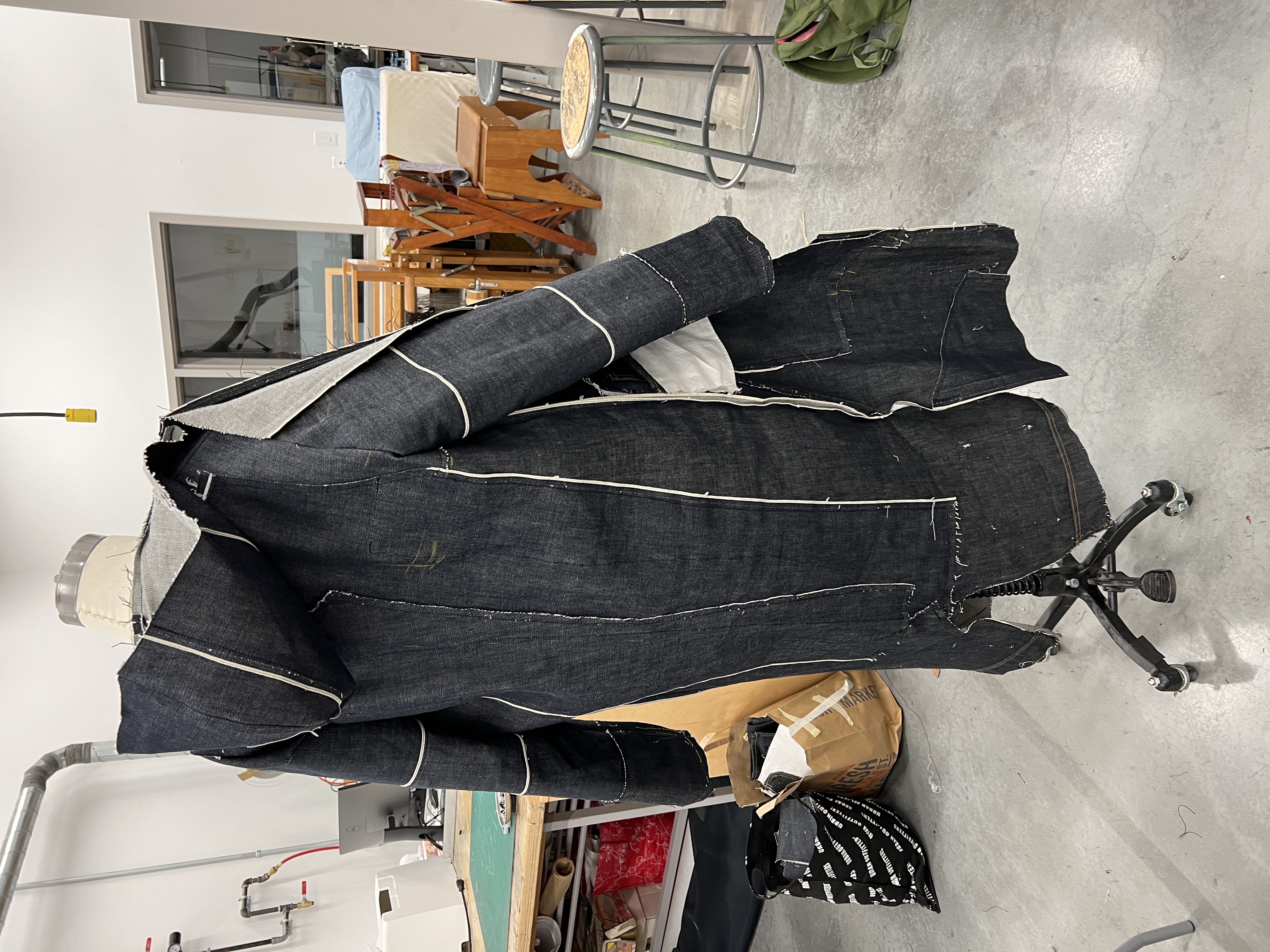 Eventually I came to the construction of a traveller’s cloak, a garment constructed out of 4 or 5 deconstructed pairs of jeans that would be both functional and speculative. It would serve as an inquiry into to what happens to perceived “useless” materials. Denim that would have otherwise gone to a landfill is repurposed to significantly extend it’s lifespan.