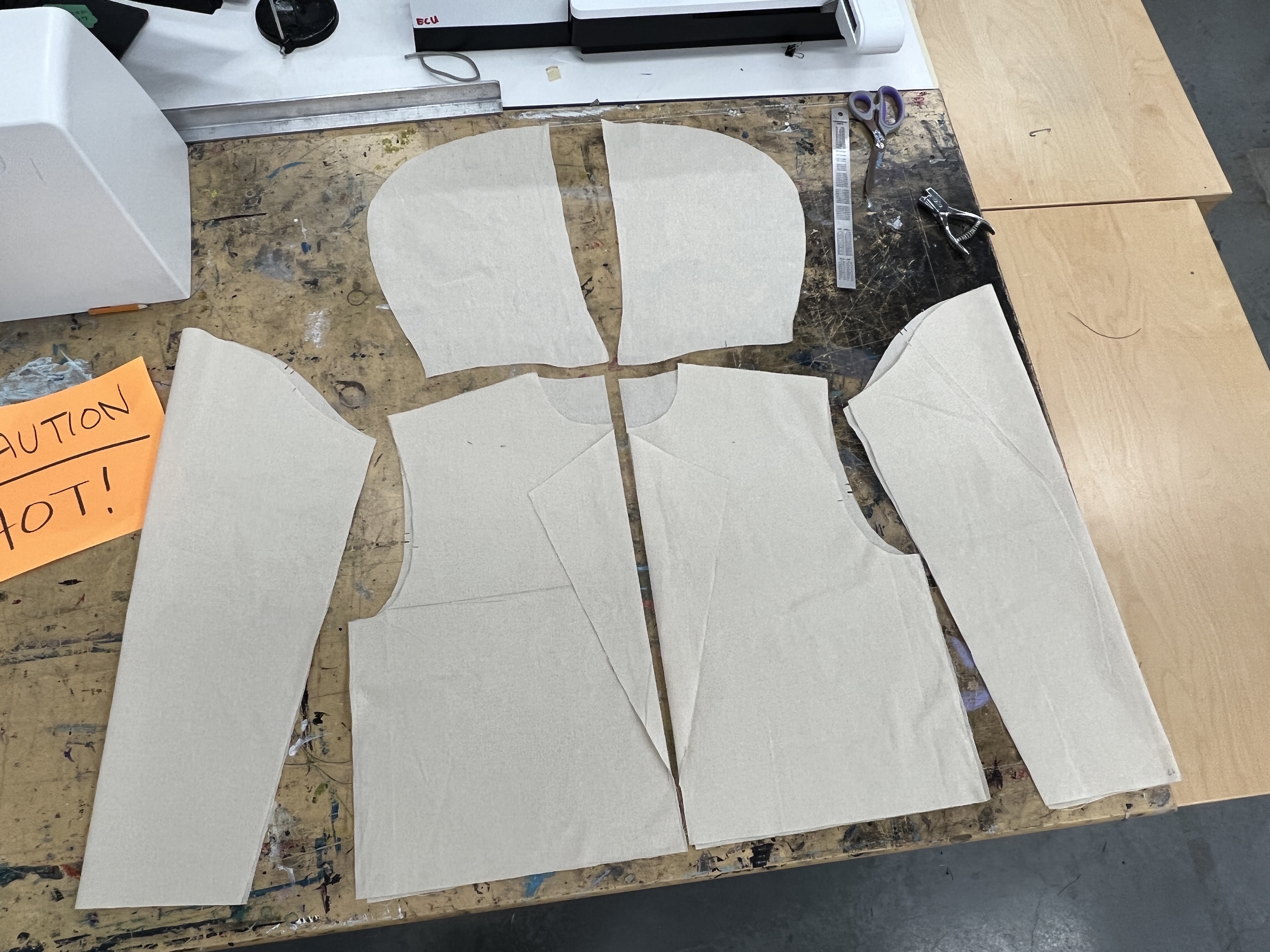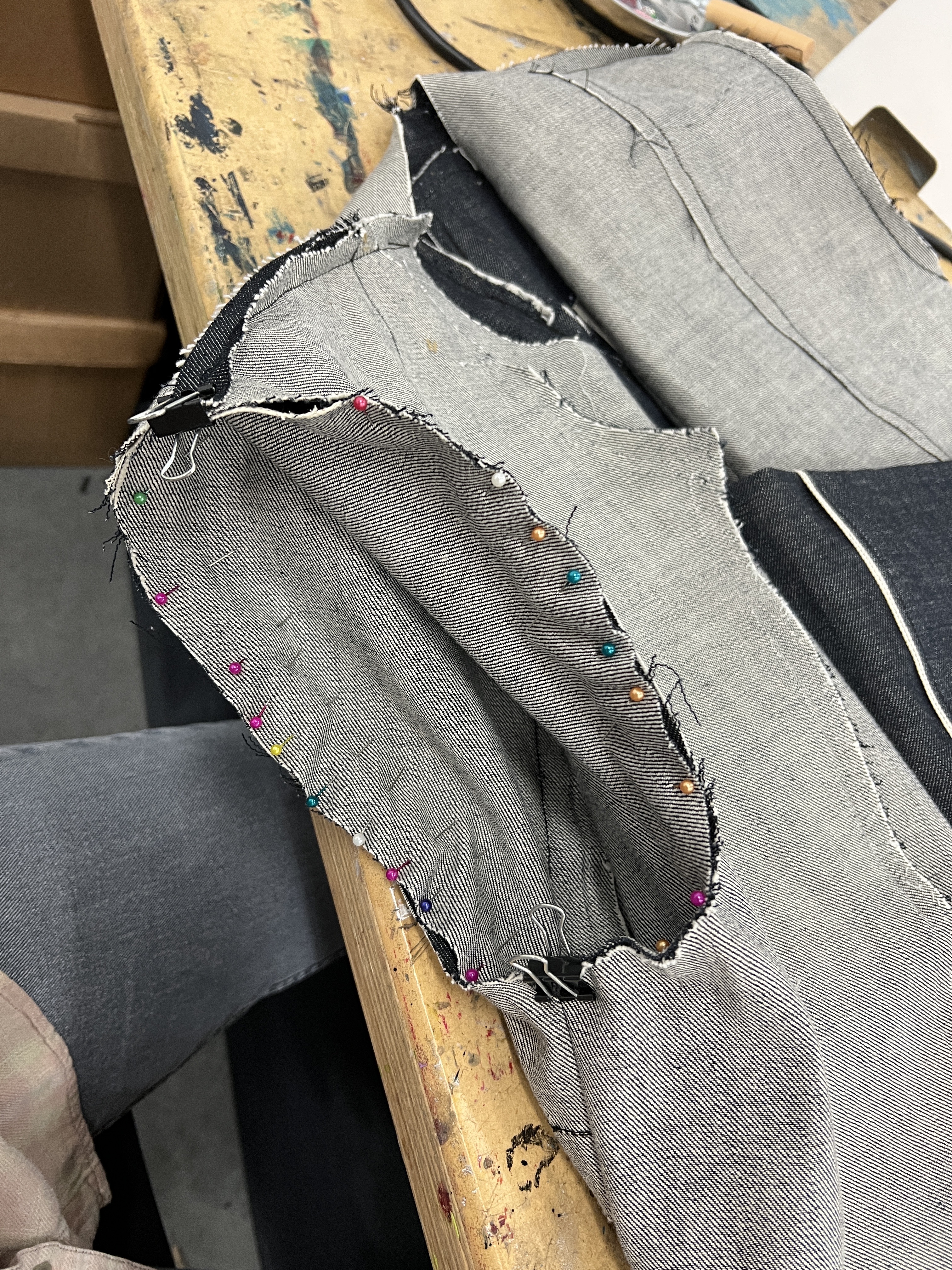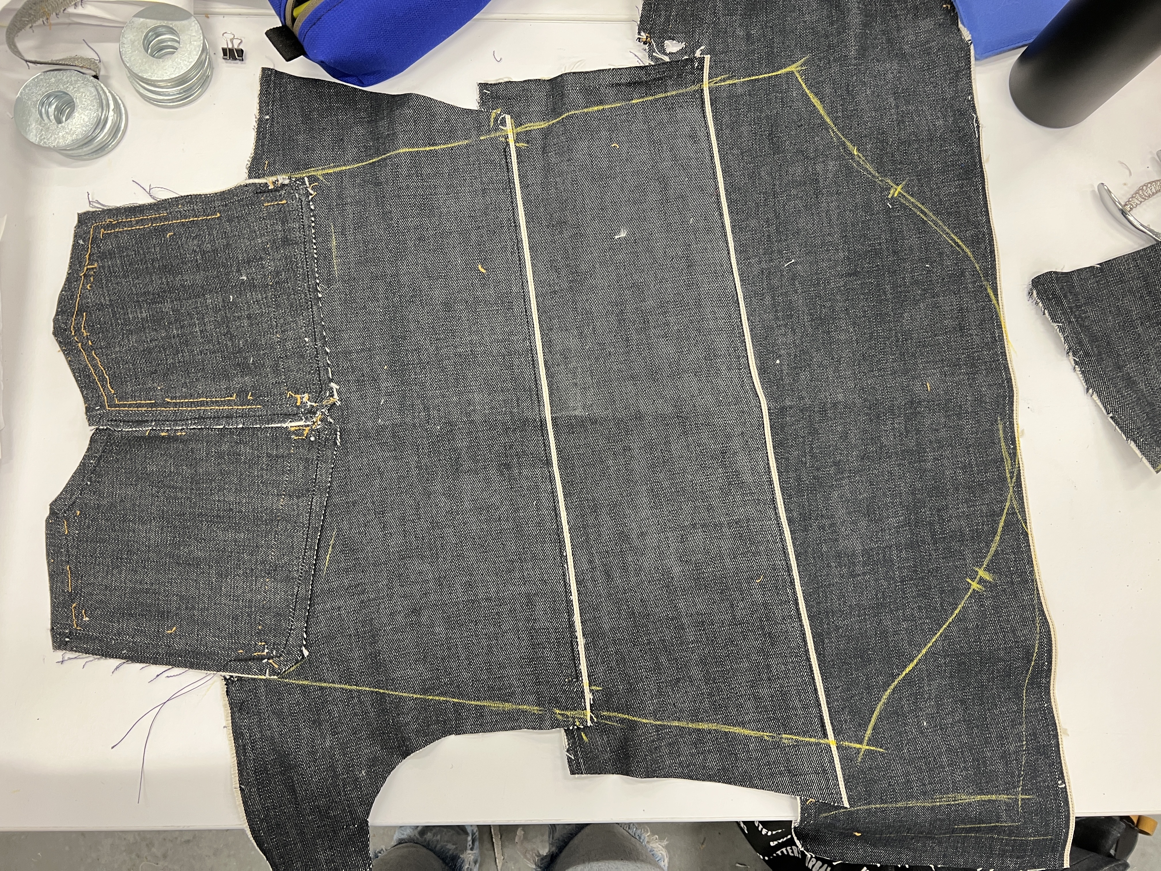 Eventually I came to the construction of a traveller’s cloak, a garment constructed out of 4 or 5 deconstructed pairs of jeans that would be both functional and speculative. It would serve as an inquiry into to what happens to perceived “useless” materials. Denim that would have otherwise gone to a landfill is repurposed to significantly extend it’s lifespan.