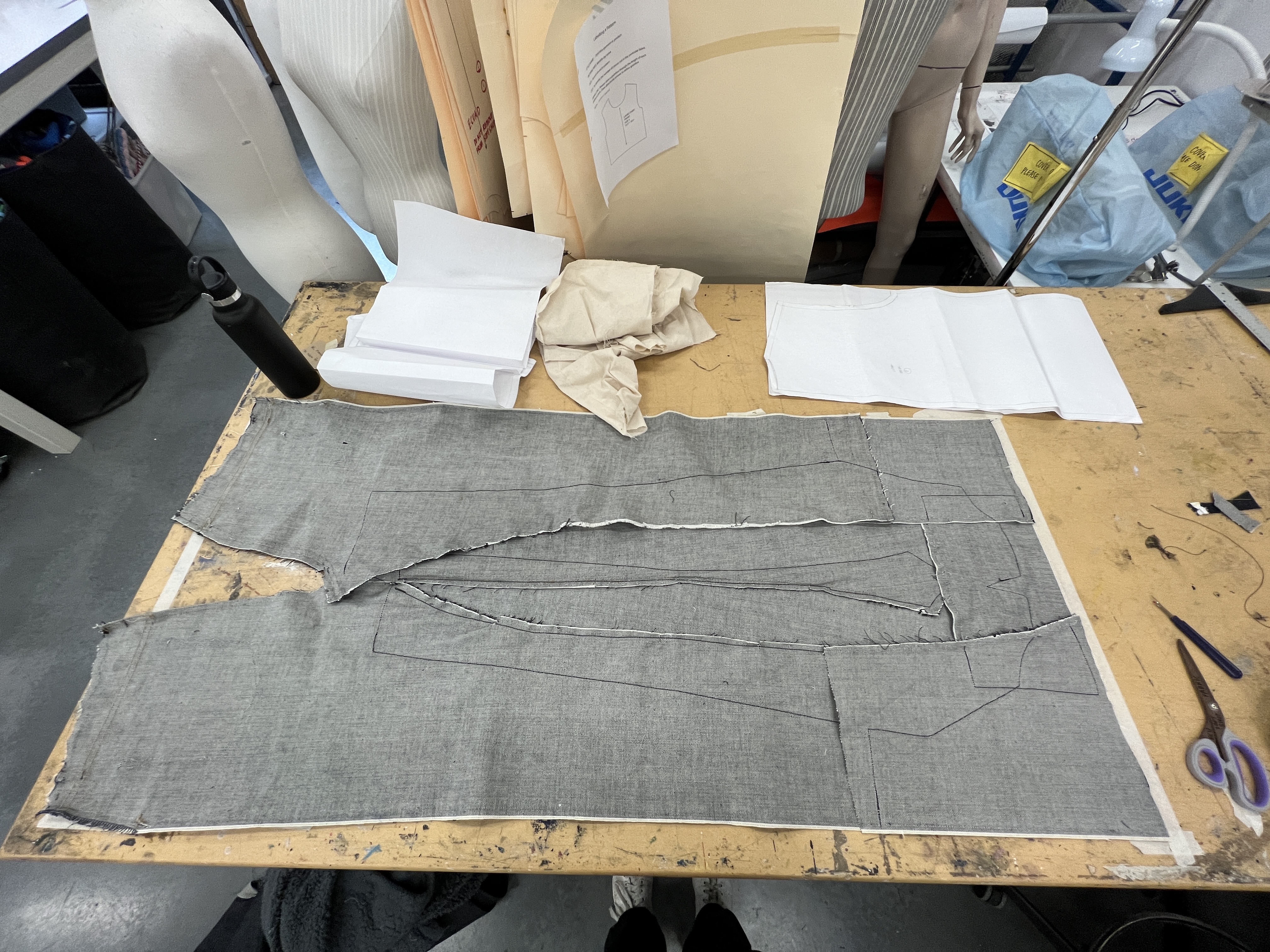 6-8. The process of reconstructing that which has been deconstructed. Reworking pieces of denim into a new patchwork that would eventually become a new garment. Pieces were made with the intention of producing as little waste as possible, working with existing lines and curves to make a piece of the pattern. 9-11. The final construction of the cloak, because it is a speculative piece there are raw and finished edges. It is reversable, one side showing the patchwork that incorporated the selvedge edges and the other showing the stiching that patched pieces together.